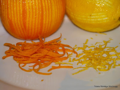 Legg gelatinplatene i bløt i kaldt vann. Lag et langsgående snitt i vaniljestangen og skrap ut frøene med en kniv. Kok fløten forsiktig opp og tilsett sukker, vaniljestang og frø, samt revet sitron- og appelsinskall. Klem vannet ut av gelatinplatene og rør de i fløteblandingen, til alt er smeltet. Tilsett tjukkmelken, bruk en visp og rør godt.