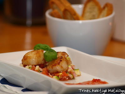 Kamskjell med tomatsalsa og sweet chilisauce