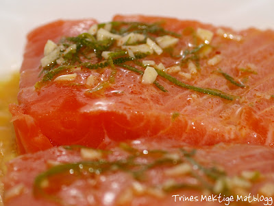 Marinade av:2 ss god olivenolje1 lime, saft og skall1 hvitløksbåtkajennepeppersalt