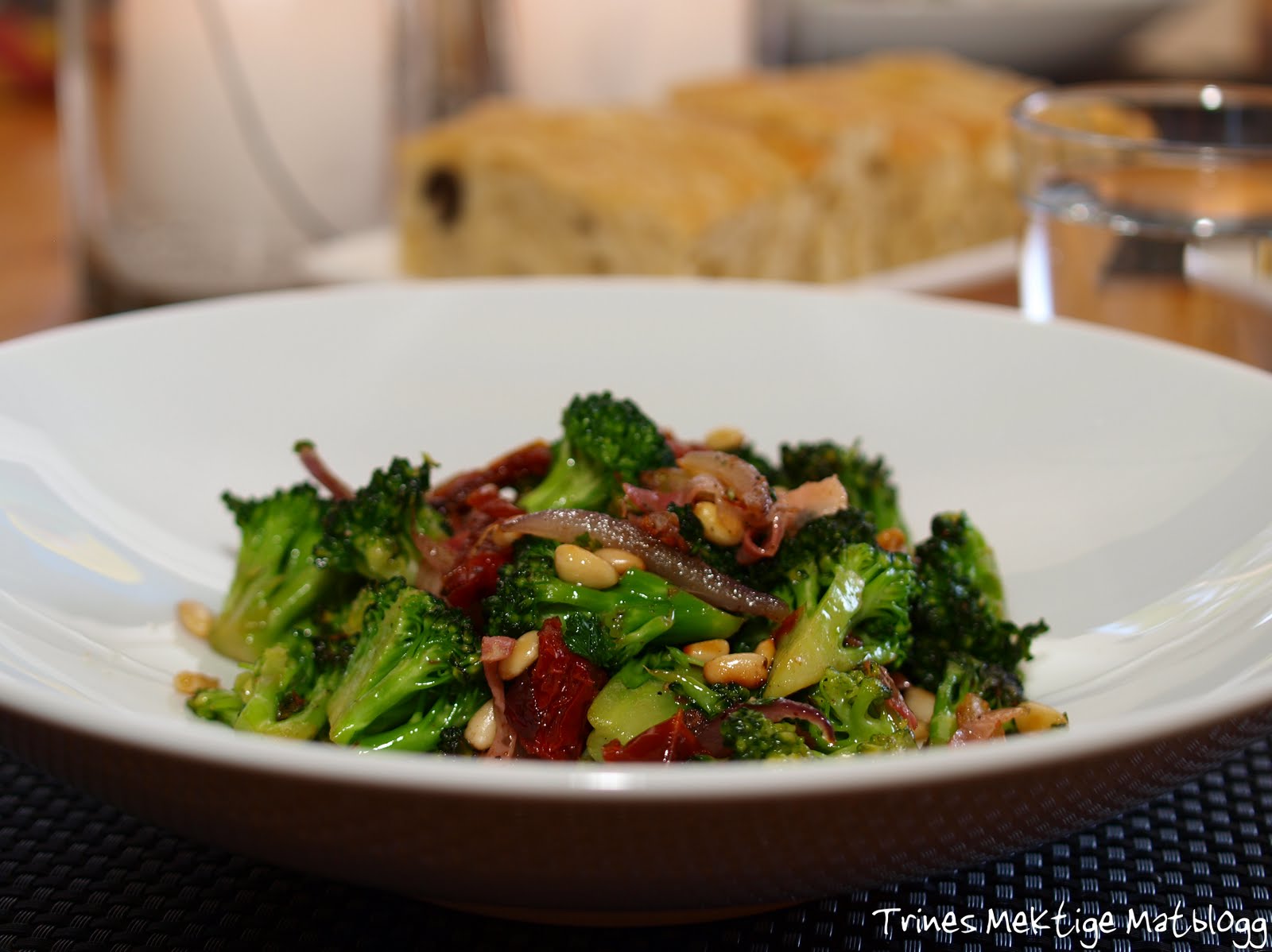 Brokkoliwok med spekeskinke, soltørket tomat og pinjekjerner