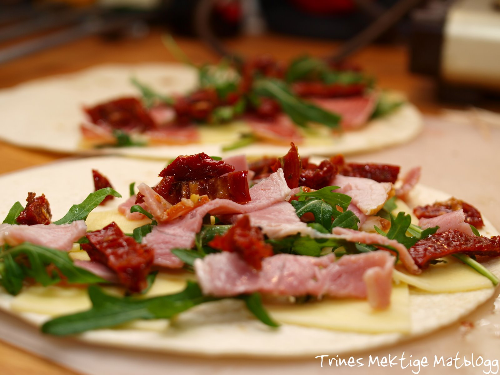 Fordel ruccula, osteskiver, soltørket tomat og skinke på den ene halvdelen av hver tortilla.