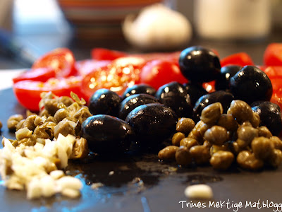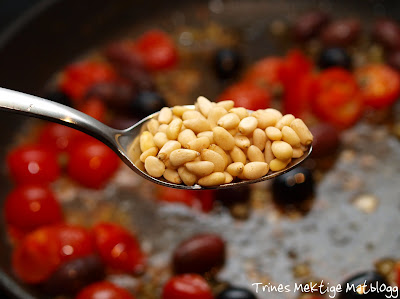 La tomatene frese 1-2 minutter, tilsett hvitløk, hakket og hel kapers (tilsammen 1 ss), oliven og pinjekjerner. Rør sammen og la blandingen bli varm, skal ikke koke!