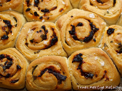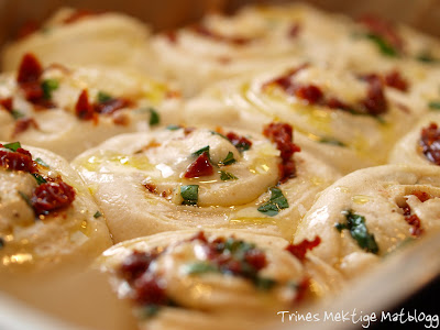Kjevle ut deigen til et rektangel og fordel tomatblandingen over. Rull sammen og skjær små jevne boller à la skillingsboller.
