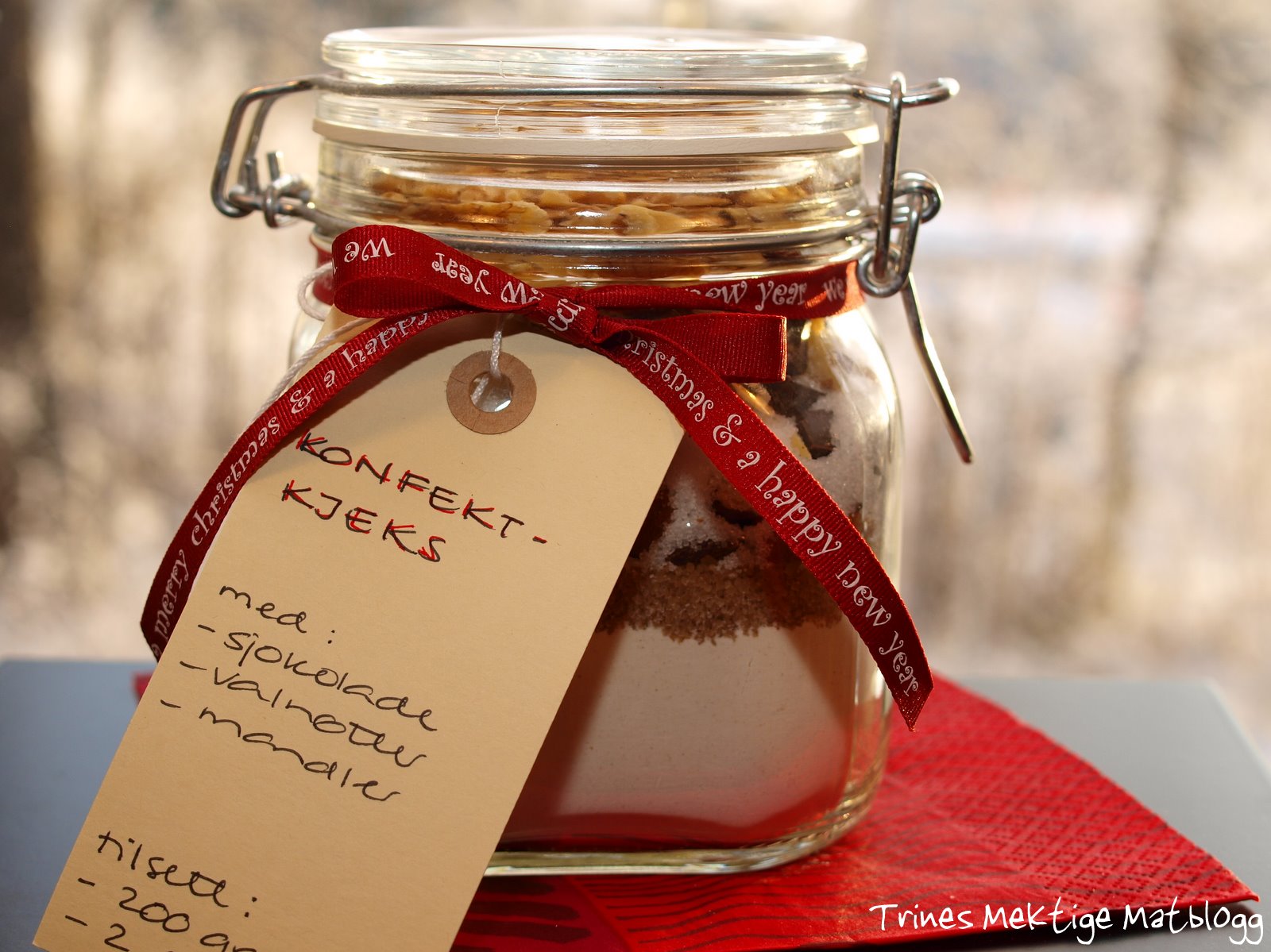 Jeg har inntrykk av at mange tror at vi matbloggere tenker på mat hele tiden. Det er ikke tilfelle for min del i alle fall. Men, jeg er alltid på jakt etter inspirasjon og nye ideer, og lar meg villig spore av dersom anledningen byr seg. Som for eksempel da jeg tittet innom en av mine favorittblogger Vaffelhjerte forleden. Elise hadde laget et gaveglass med ingredienser til havregrynscookies, og jeg adopterte ideen umiddelbart og prøvde den ut på konfektcookiesoppskriften min. Det geniale bak konseptet er at en blander alt det tørre på et glass, og mottakeren skal selv tilsette smør og egg, blande sammen – og steke. Nøye anvisninger følger selvfølgelig med, her skal selv den mest uerfarne og klossete baker kunne oppleve mestringsfølelse og glede på kjøkkenet, og deretter nyte sine egne, nydelige og velduftende bakverk. Det er jammen litt av en gave!