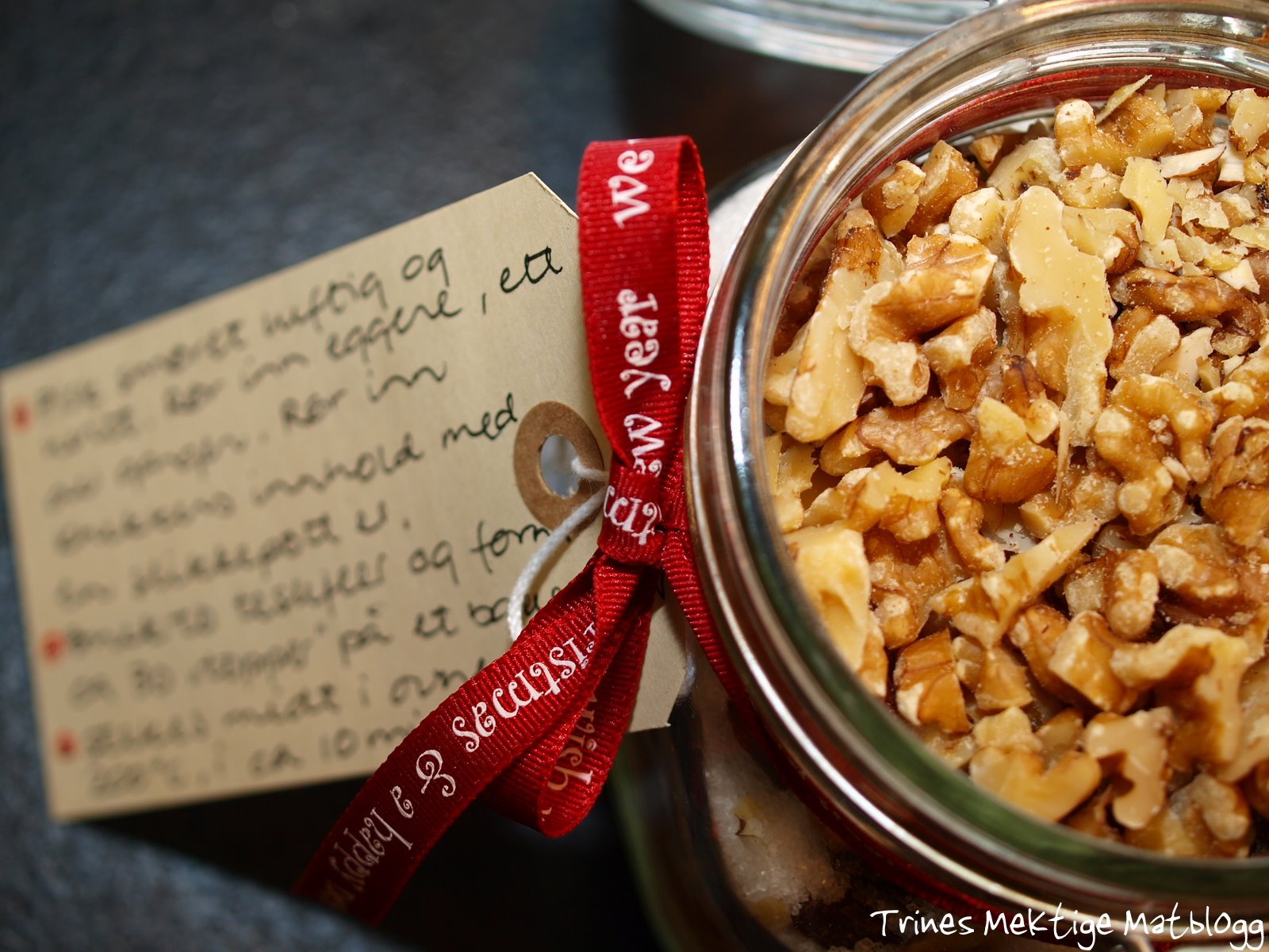 Skriv ned oppskriften på et lite kort og fest med en sløyfe eller bånd på glasset.