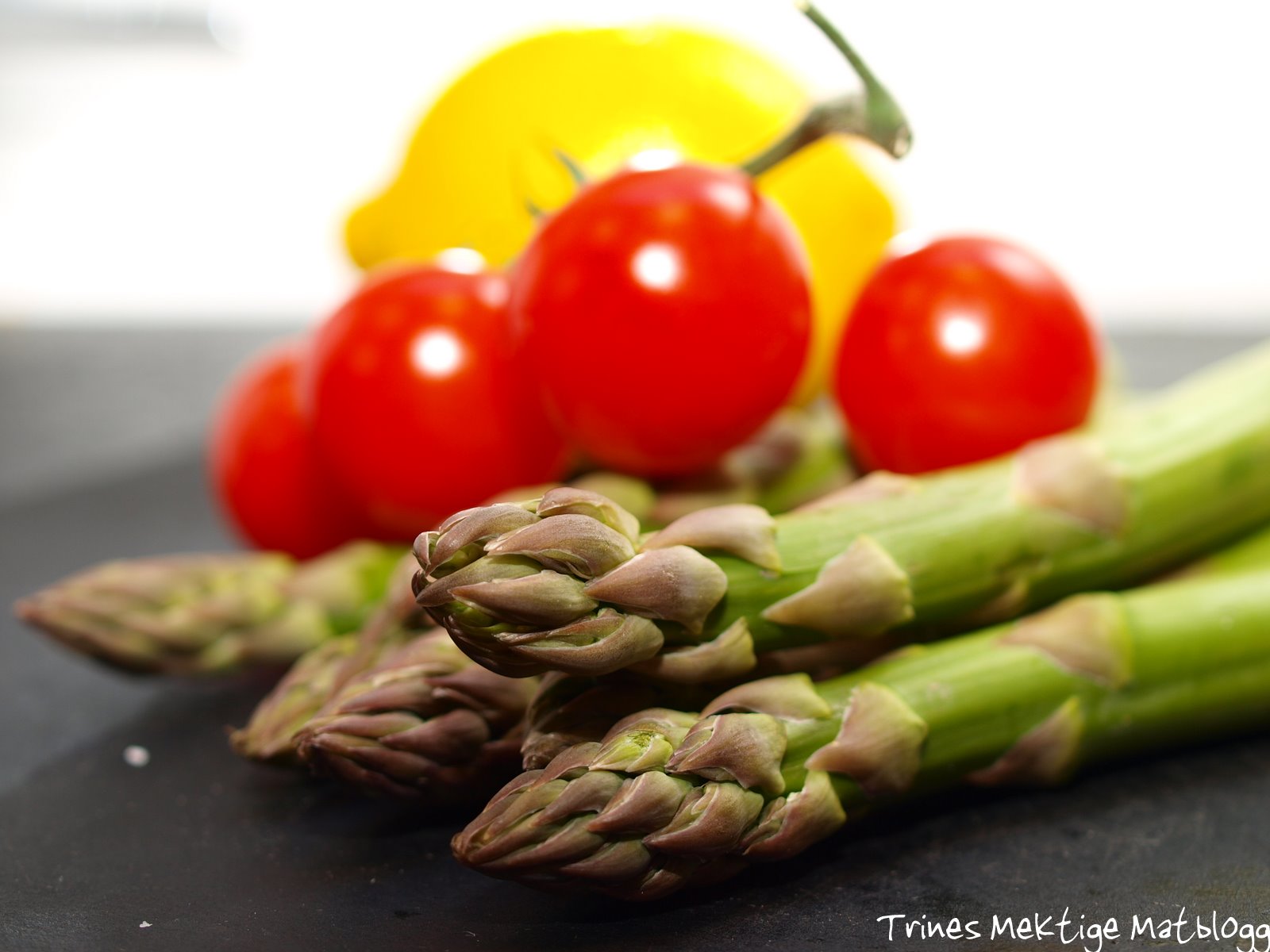Aspargesen kokes i saltet vann i ca 3 minutter og taes opp av vannet. Du kan eventuelt erstatte asparges med stekt squash eller brekkbønner.