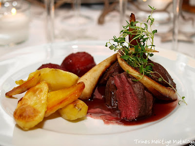 (Menyen for øvrig besto av forrett: Dampet laks med rødvinskokte småløk og safrankrem, mellomrett: Bleu d’Auvergne med druekompott og Hvit sjokolademoussè med skogsbærconsommè til dessert.)