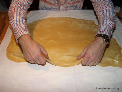 Så over til «moroa»: Spenn et rent laken på bordet og ha litt mel på. Legg deigen i midten av bordet, kjevle ut litt i bredden og pensle på olje (for å unngå at deigen klistres sammen når man trekker den ut). Ha mel på håndryggen, hold under deigen og trekk ut mot bordkantene (veldig forsiktig), til deigen er papirtynn. Trekk ut mot den ene kanten og fortsett mot den andre kanten. Skjær av tykke kanter. Nå skal man kunne lese en avis gjennom deigen (hehe) og den er klar for å bli fylt.