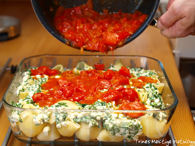 Fordel ricottafyllet over pastaskjellene (og aller helst inni skjellene), og hell tomatsausen over. Gratiner retten ved ca 200 grader i ca 20 minutter. Serveres med god rød eller hvit vin, samt godt brød til!