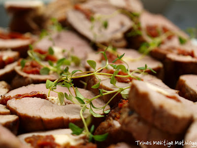 Svinefileten: Rens kjøttet for hvite hinner og skjær et langsgående snitt på fileten, slik at du kan brette den ut. Fordel fetaost, soltørkede tomater og krydderurter, og krydre med nykvernet pepper. Rull fileten stramt sammen og surr hyssing rundt, slik at fyllet holder seg inni fileten.