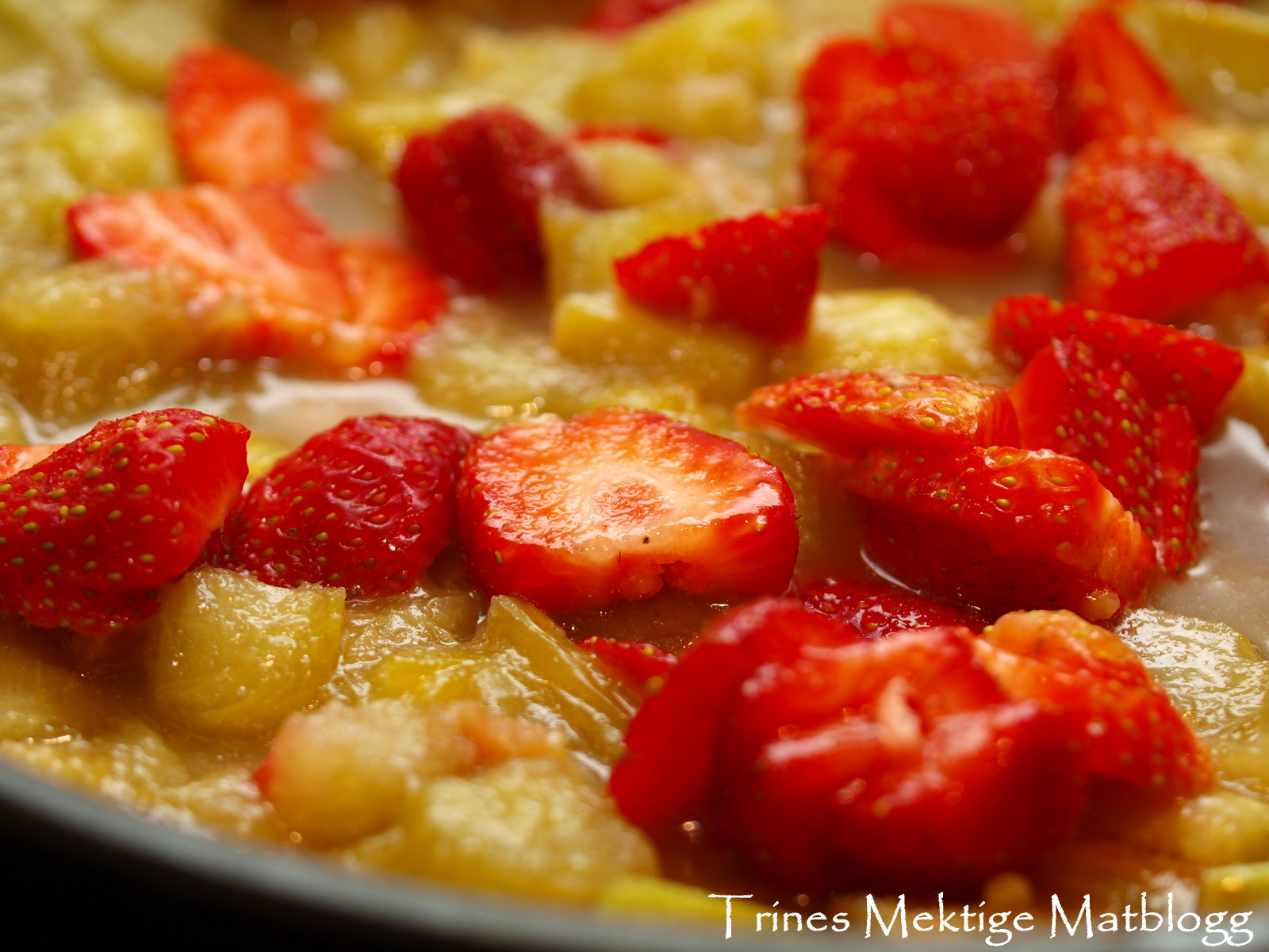 Smelt ca 1 dl av sukkeret i en ren stekepanne og tilsett smør, rabarbra og ingefær. Syre og sukkerinnhold i rabarbra varierer en del så du må smake etter hvorvidt du trenger å tilsette mer sukker eller ikke. Stek/kok videre til rabarbraen er mør og fin. Tilsett jordbær i skiver og rør det hele sammen. Ta stekepannen av platen.