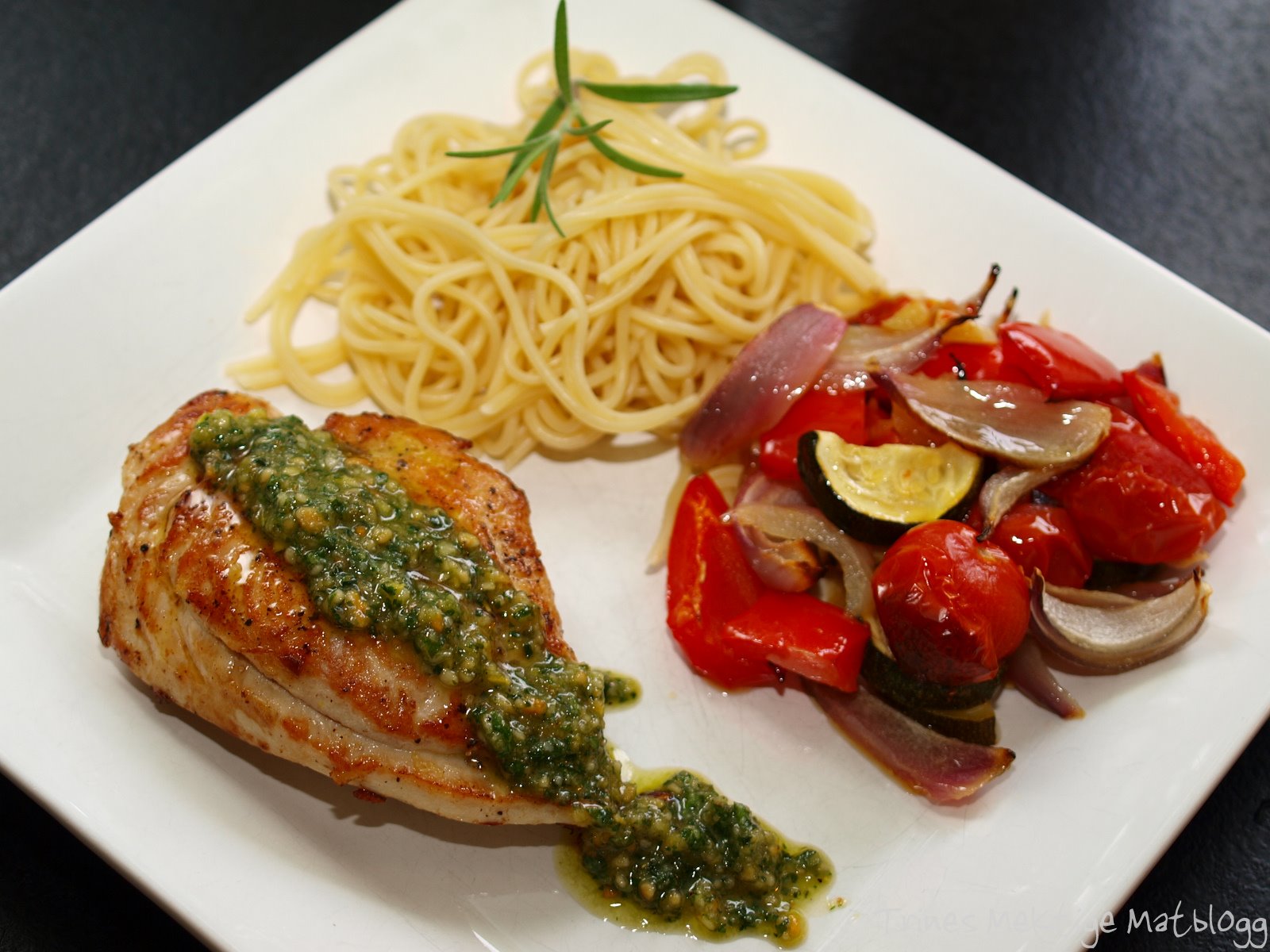 En enkel og god favoritt med kylling, søte og møre ovnsbakte grønnsaker og en deilig hjemmelaget pesto. Mmmmm…. Til 3-4 porsjoner trenger du omtrent: