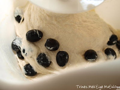 Ha hele, stenfrie oliven i deigen og kjør forsiktig til olivenene såvidt er innarbeidet i deigen. Kjører du deigen for lenge knuses olivnene og det vil vi ikke ha noe av!