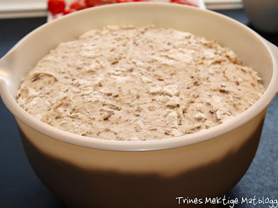 (* I oppskriften skal det være 40 gram salt, men jeg tilsatte kun ca 25 gram. Synes ofte brødoppskrifter kan inneholde for mye salt, men det er jo smak og behag.)