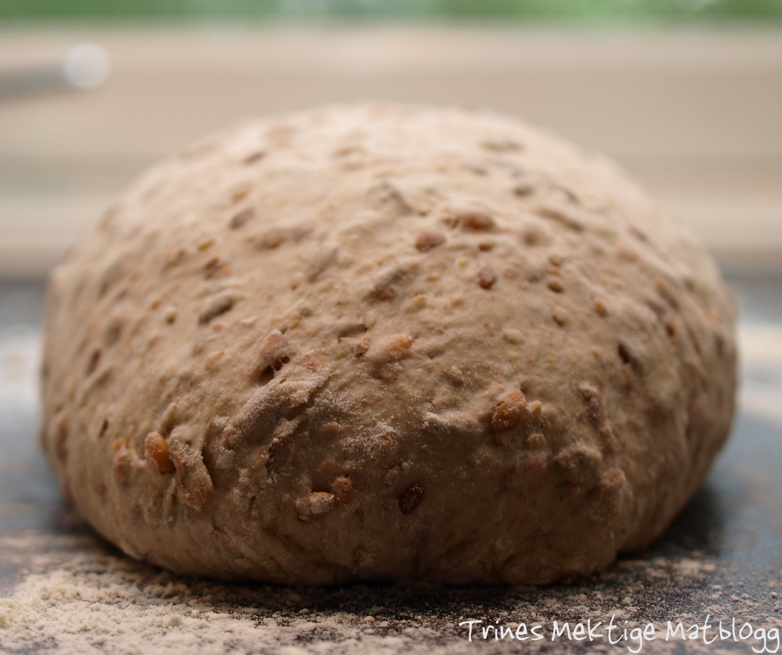 Ha deigen over i en større bakebolle og la heve i ca 1,5 time eller gjerne enda lengre om du har tid til det. Ha deigen på bakbordet og del den i 3 eller 4 like emner. Jeg laget 3 brød da jeg har 3 relativt store brødformer, som akkurat får plass i stekovnen sammen. La emnene hvile i ca 20-30 minutter.