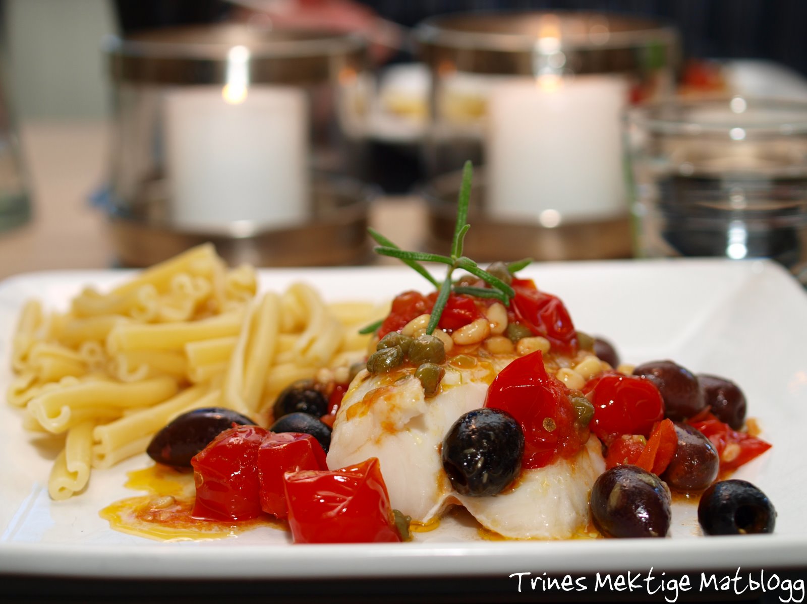 Scenarioet bak denne retten var at jeg hadde tatt opp torskefilet fra fryseren om morgenen, og da jeg kom trøtt og sliten hjem fra jobb på ettermiddagen så hadde jeg ikke den villeste anelse om hva jeg skulle gjøre med fisken, annet enn av jeg hadde lyst til å servere kapers og oliven til. Frem med lap-topen og ut i den store wwwerden. Søket lød «torsk kapers oliven«, og jammen dukket ikke God-Morgen-Wenche opp på skjermen. Det er ofte trygt å følge Wenches råd, og innen 20 minutter sto maten faktisk på bordet!