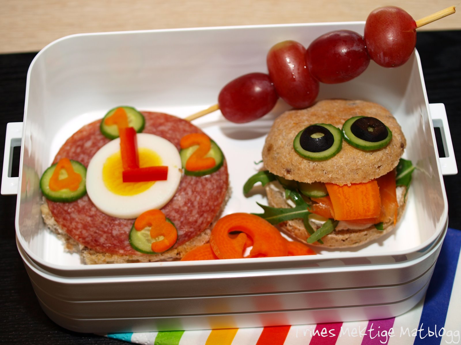 Den neste matpakken består av «klokkebrødskive» med salami, egg, agurk, paprika og gulrøtter, samt et grovt «froskerundstykke» med Snøfriskost, ruccula, røkt laks, gulrot-tunge og agurk- og olivenøyne. I tillegg et spyd med druer, samt oppskåret gulrot.