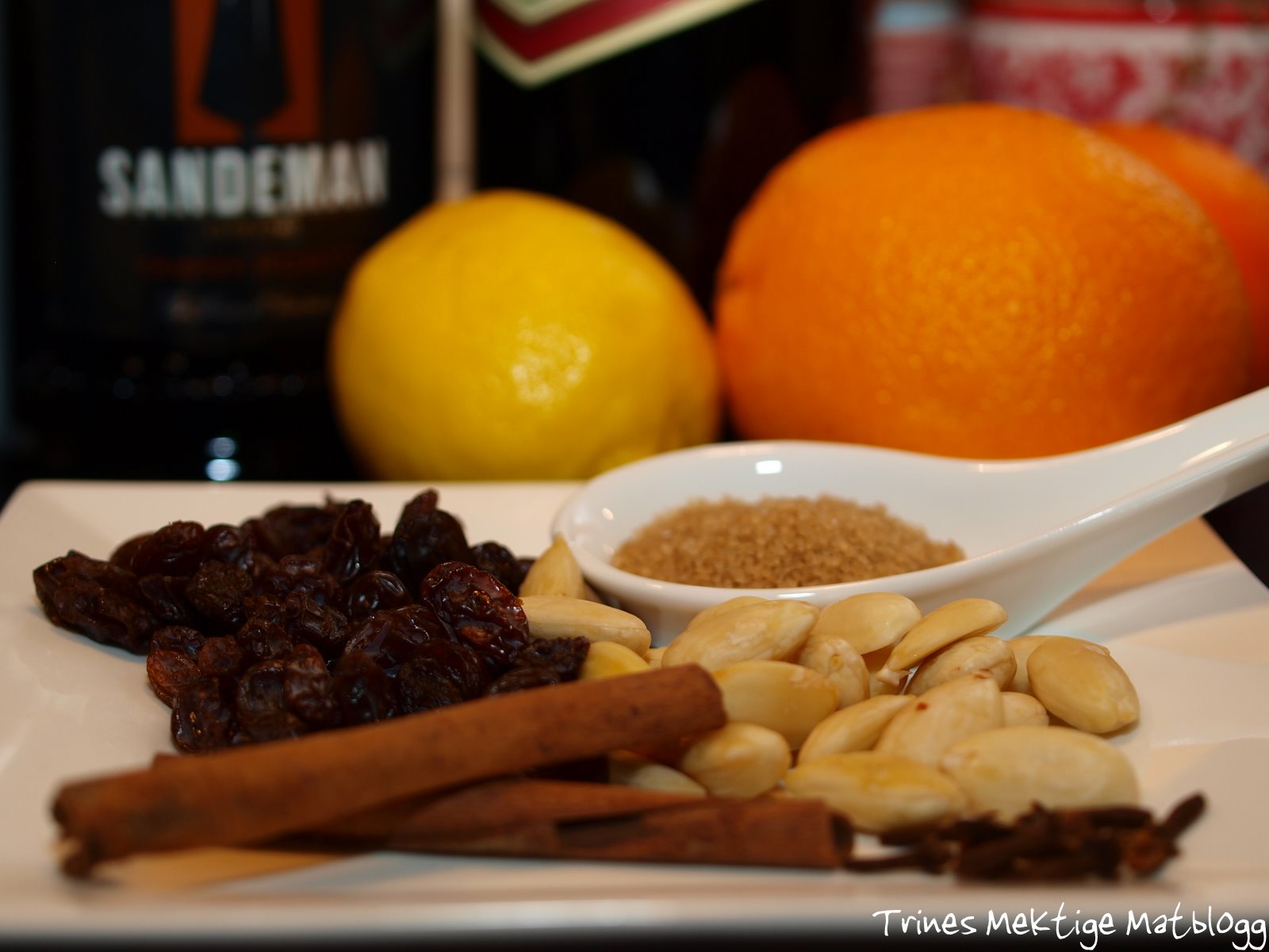 Bland sammen portvin, rosiner, mandler, sitron- og appelsinsaft, samt krydderet, og la det trekke på et lunt sted i minst 1 time.
