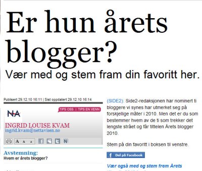 Desember 2010. Jeg ble nominert av Side2 til Årets blogger, hvor jeg kom på 6. plass: