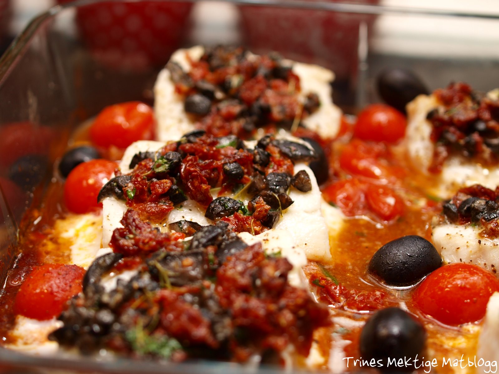 Ukens fiskerett er en rask, enkel og velsmakende torskerett. Jeg er utrolig glad i torsk og synes det er spennende å variere med tilbehør og ulike smaker. Hva jeg benytter vil selvsagt være avhengig av hva jeg har tilgjengelig i skuffer og skap; jeg har nemlig ikke alltid oppskrift og nødvendige ingredienser klar på forhånd, bare av og til. Tomat og oliven har jeg stort sett alltid på lur, og ender ofte i mine gryter, slik som i denne retten. Torsken smøres med en smakfull topping, før den bakes i ovnen. Til to store og en liten trenger du omtrent: